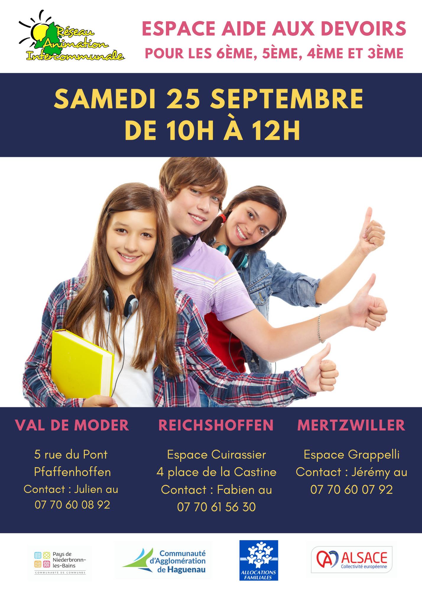 [AIDE AUX DEVOIRS 25/09 : VAL DE MODER - MERTZWILLER - REICHSHOFFEN]Les animateurs de RAI proposent un espace d'aide aux devoirs pour les 6ème, 5ème, 4ème et 3ème samedi 25 septembre de 10h à 12h - Entrée libre et gratuite
