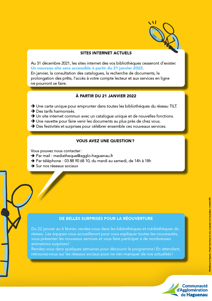 Cette fermeture a pour objectif la mise en place d’un catalogue commun aux 9 bibliothèques du Réseau TILT de la Communauté d'Agglomération de Haguenau et vous permettre l’accès à 215 000 documents.