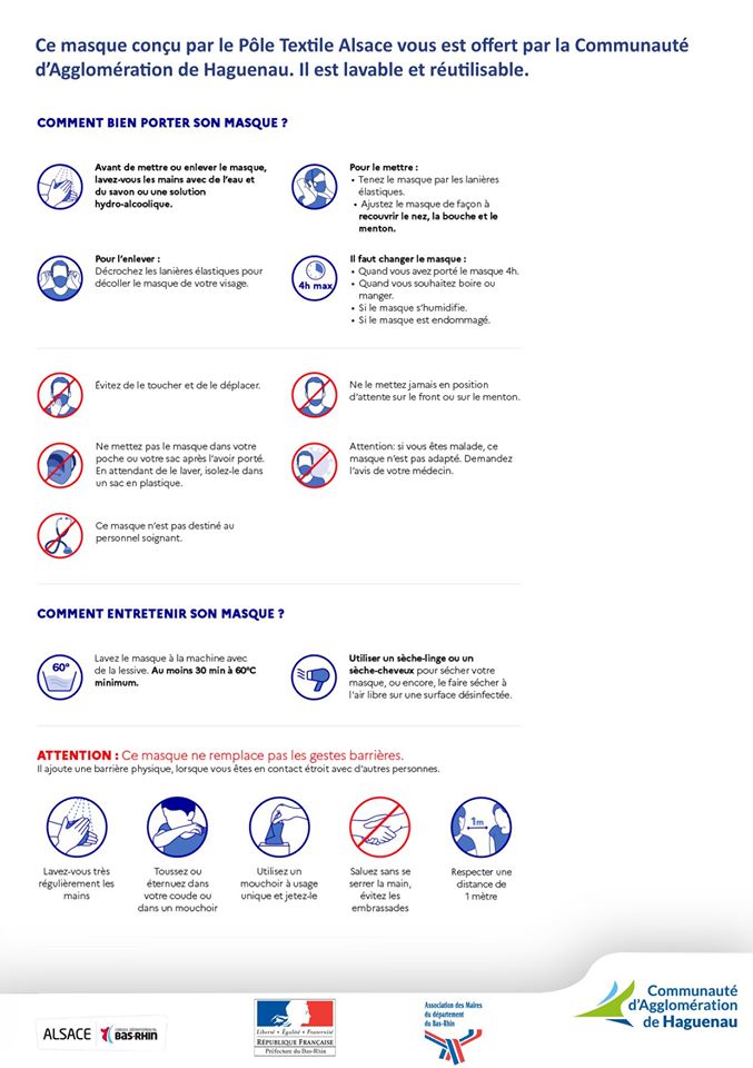 Le masque est conçu par le Pôle Textile Aslace, il est lavable et réutilisable. La distribution se fera strictement dans le respect des gestes barrières et des règles sanitaires actuelles.