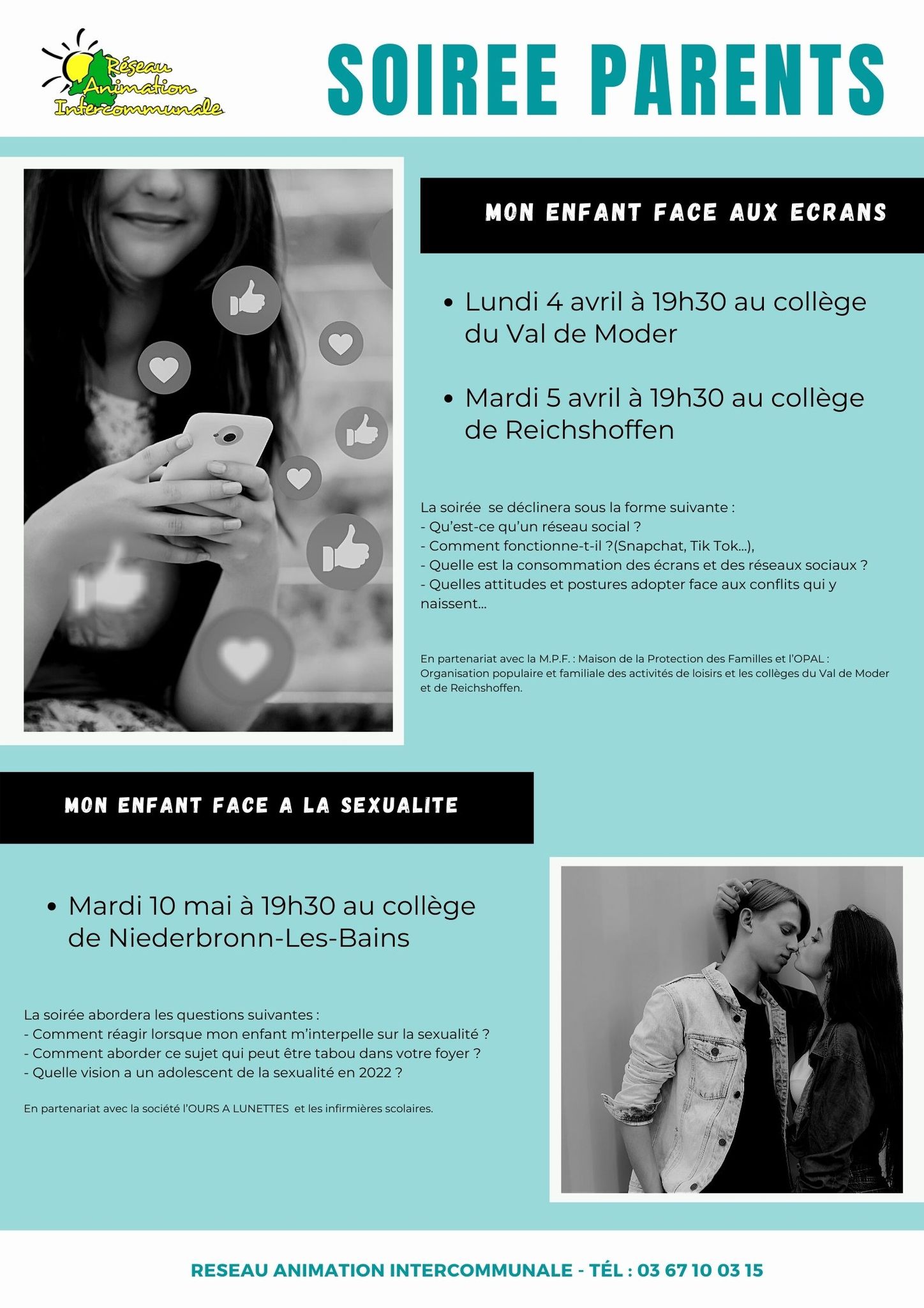 L’association Réseau Animation Intercommunale organise dans le cadre de Famille En Scène un cycle de soirées à destination des parents des collèges de Val de Moder, Schweighouse-sur-Moder, Niederbronn-les-Bains, Reichshoffen et Mertzwiller.